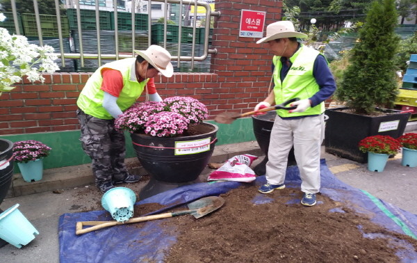 최근 도봉구가 지역내 20년 이상 거주한 장년 남성 3명으로 구성된 나눔이웃인 ‘창2동 정원사’와 함께 국화 심기 활동을 진행했다. 사진은 활동에 참여한 창2동 정원사들이 화분에 국화를 식재하고 있는 모습.(사진제공=도봉구청)