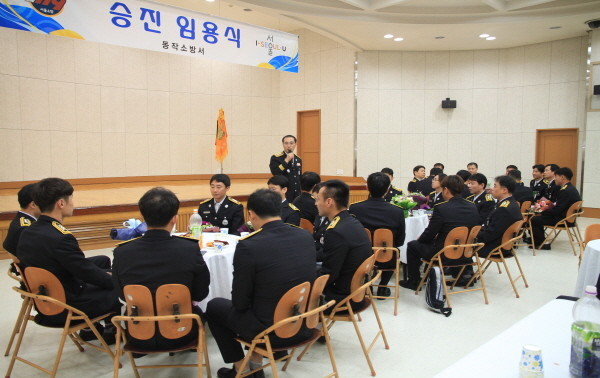 동작소방서는 최근 3층 강당에서 2017년 10월 중 근속승진자 대상자에 대한 신고식을 실시했다. 사진은 박찬호 서장이 근속승진자들에게 덕담을 건네는 모습.(사진제공=동작소방서)
