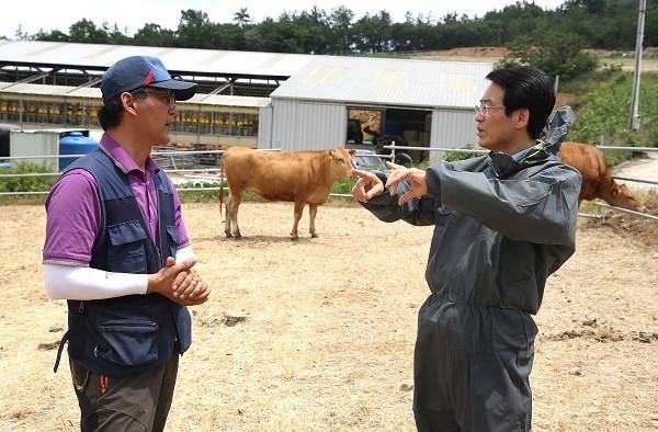 | ▲ 사진설명 : 강진원 강진군수(우측)가 한우개량 선도 농가를 방문해 개량분야 시책에 대한 의견을 교환하고 있다. | ||