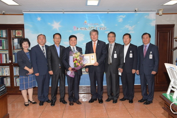 지난 10일 경기 동두천시가 신흥고등학교 교장 이인규씨를 10월 ‘동두천시 1일 명예시장’에 위촉했다. 이 명예시장은 본청의 각 부서를 방문해 업무추진상황 등을 보고받고, 사업현장 등을 찾는 등 1일 명예시장으로서의 역할을 수행했다. 사진은 위촉식 모습.(사진제공=동두천시청)