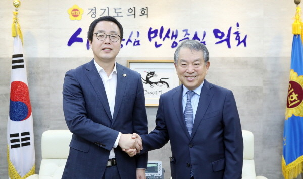 | ▲ 경기도의회 의장 접견실에서 정기열 경기도의장(왼쪽)이 황태현 경기평택항만공사 신임사장과 악수를 나눈 뒤 기념촬영을 하고 있다. | ||