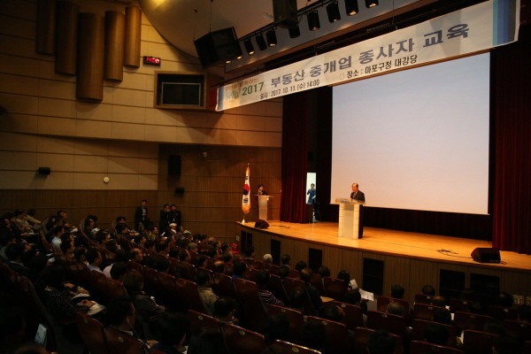 박홍섭 서울 마포구청장이 지난 11일 오후 마포구청 대강당에서 열린 부동산중개업 종사자 교육에 참석해 인사말을 하고 있다. 이날 교육에는 지역내 부동산중개업 종사자 500여명이 참석했다.(사진제공=마포구청)