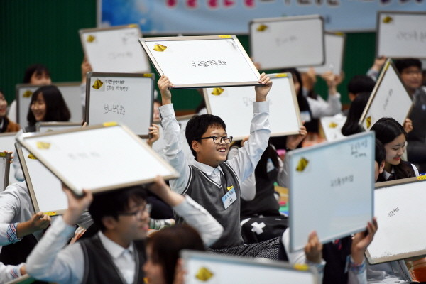 지난 11일 경기 오산시민회관에서 지역내 중학생 및 학교장, 학부모, 자문위원 500여명이 참석한 가운데 ‘2017년 중학생 역사통일 골든벨 행사’가 개최됐다. 사진은 퀴즈 참가자들이 정답을 적은 보드를 들고 있는 모습.(사진제공=오산시청)