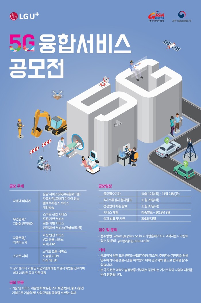 [시민일보=이진원 기자]LG유플러스가 다가오는 ‘5G 시대’를 대비해 미래성장 동력을 발굴하고 개발하기 위한 ‘5G 융합서비스 공모전’을 진행한다고 12일 밝혔다.