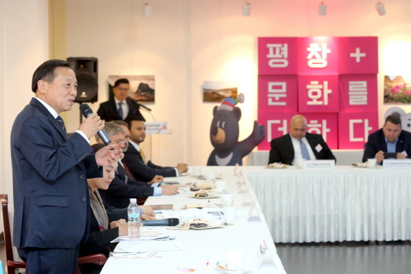 지난 11일 오후 1시 금천구청에서 평창문화올림픽 ‘월드 컬처 콜라주(World Culture Collage)’ 리셉션 및 오프닝 행사가 개최됐다. 사진은 차성수 구청장이 주한외교대사관들이 참석한 ‘월드컬처콜라주’ 리셉션에서 인사말을 하는 모습.(사진제공=금천구청)