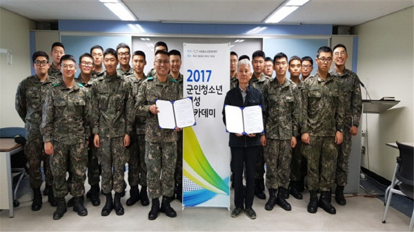 지난 12일 경기 이천시청소년육성성재단 서희청소년문화센터가 육군 제3901부대 1대대와 군인청소년 인성교육을 위한 업무협약을 체결하고 오는 12월15일까지 6회에 걸쳐 120명을 대상으로 ‘군인청소년인성아카데미’를 실시한다. 사진은 관계자들이 군인들과 기념촬영을 하는 모습.(사진제공=서희청소년문화센터)