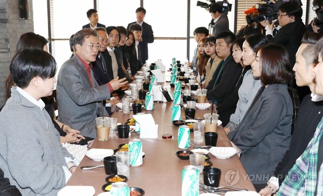 문재인 대통령이 15일 현직대통령으로는 처음으로 부산국제영화제를 찾아 부산 해운대구 한 영화관에서 ‘미씽:사라진여자’를 관람한 후 영화전공 학생들과 오찬을 함께하며 대화를 나누고 있다.