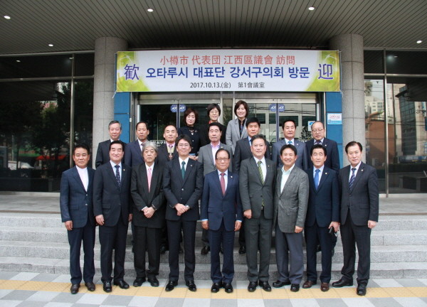 | ▲ 서울 강서구의회를 방문한 일본 오타루시 대표단이 이영철 강서구의장(가운데)을 비롯한 의원 등 관계자들과 기념촬영을 하고 있다.(사진제공=강서구의회) | ||