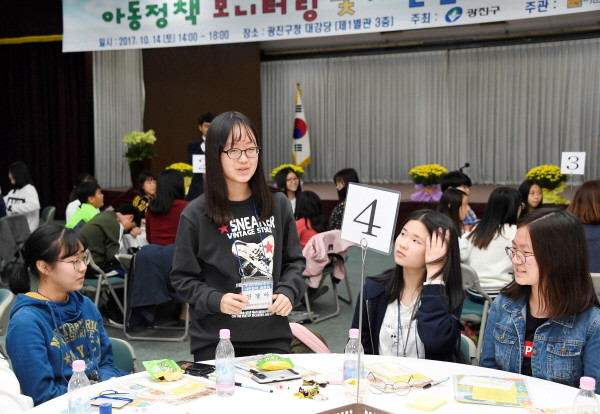 서울 광진구는 지난 14일 오후 2시 구청 대강당에서 구에 거주하거나 지역내 학교에 재학중인 아동·청소년, 부모, 아동관계자 등 120여명이 참여한 가운데 ‘아동친화도시 조성을 위한 시민참여 열린토론회’를 열었다. 사진은 참여자들이 토론하는 모습.(사진제공=광진구청)
