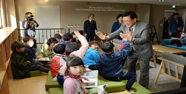 최근 동대문구가 답십리1동 주민센터의 새로운 청사 건립을 기념한 개청식을 개최했다. 사진은 개청식에 참석한 유덕열 구청장이 3층에 마련된 북카페에서 어린이들과 인사하고 있는 모습.(사진제공=동대문구청)