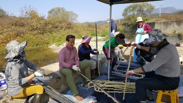 경기 포천시 창수면 주민자치위원회는 지난 17일 위원 및 창수초등학교 학생 30여명이 참석한 가운데 추동리 소재 밭에서 효를 상징하는 ‘청려장 지팡이’의 제작을 위한 명아주를 수확했다. 사진은 수확한 명아주를 손질하는 관계자들의 모습.(사진제공=포천시청)