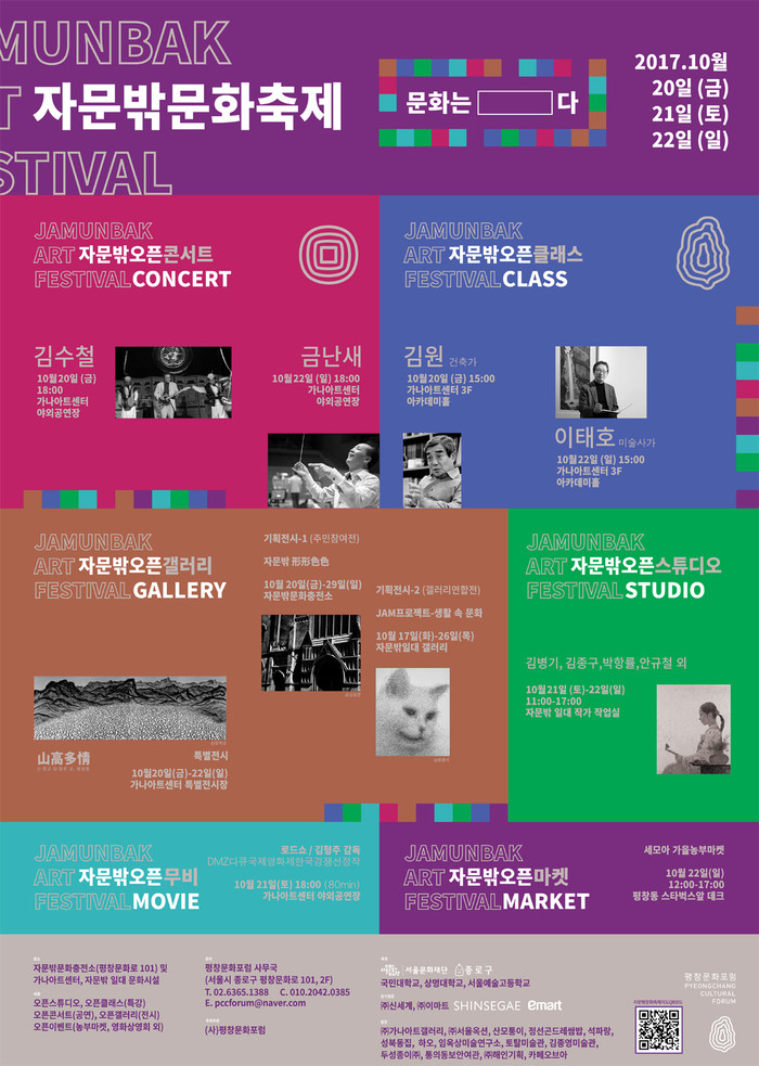 「2017 자문밖 문화축제-“문화는 다”」에 관한 정보나 사전 공연 예약, 기타 더 궁금한 사항은 (사)평창문화포럼 사무국으로 문의하면 된다.