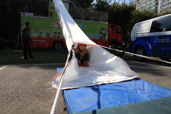 동작소방서는 지난 17일 오전 10시 신대방동에 위치한 남부수도사업소 주차장에서 지역내 유치원(명수유치원, 꿈나라유치원) 원생 80여명을 대상으로 '이동안전 체험차량'을 운영했다. 사진은 어린이가 구조대 탈출 체험을 하는 모습.(사진제공=동작소방서)