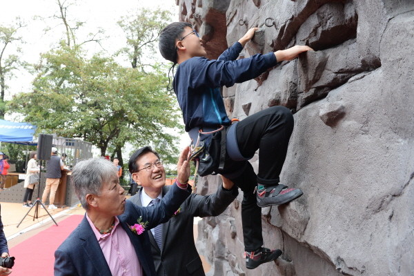 18일 동대문구 배봉산에서 열린 ‘배봉산 청소년 체육시설 준공 행사’에 참석한 유덕열 구청장과 산악인 엄홍길 대장(왼쪽)이 암벽등반 시범을 보이는 어린이를 격려하고 있다.(사진제공=동대문구청)