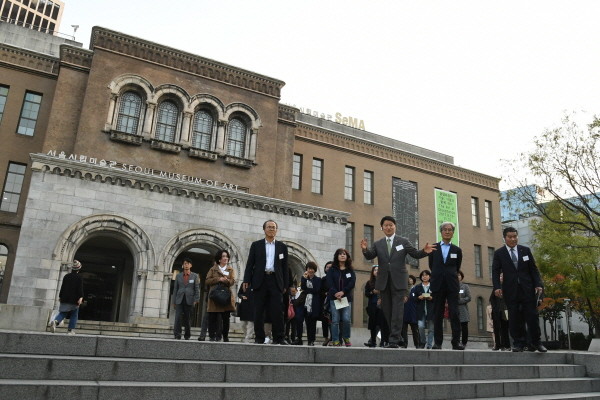 지난 17일 중구는 지역내 학교장 25명을 초청해 정동극장, 중명전, 서울시립박물관 등을 해설사와 둘러보는 '정동 한바퀴 투어'를 실시했다. 사진은 최창식 구청장(앞줄 오른쪽에서 세 번째)이 학교장들과 시립박물관을 나서며 정동의 역사문화에 대해 설명하는 모습.(사진제공=중구청)