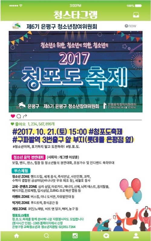 ‘2017. 청.포.도. 축제’는 체험부스, 게임․이벤트 진행, 청소년 음악경연대회 등 5개의 부스행사와 청소년 음악경연대회로 진행된다.