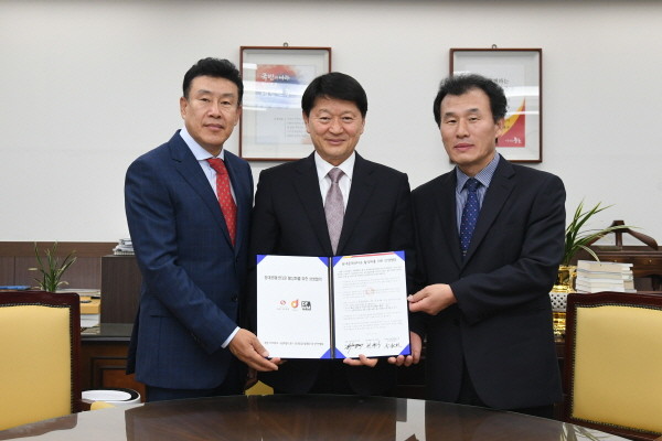 서울 중구는 지난 18일 구청장실에서 호텔 스카이파크와 동대문시장 활성화를 위한 상생협약을 체결했다. 사진은 최영재 호텔 스카이파크 대표(왼쪽부터), 최창식 중구청장, 이승렬 동대문글로벌명품시장 상인연합회장이 기념촬영을 하는 모습.(사진제공=중구청)