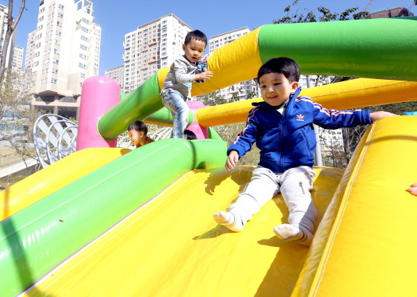 서울 금천구는 지난 20일 금나래 공원에서 금천구가정어린이집연합회 ‘한마당 큰잔치’를 개최했다. 사진은 행사에 참여한 영아들이 에어바운스에서 미끄럼틀을 타고 있는 모습.(사진제공=금천구청)