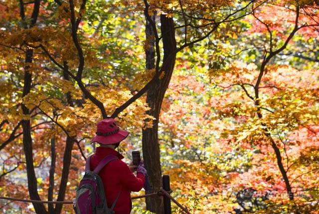 완연한 가을 날씨를 보이는 22일 오전 서울 도봉산을 찾은 등산객이 단풍으로 물든 나무 아래에서 사진을 찍고 있다.