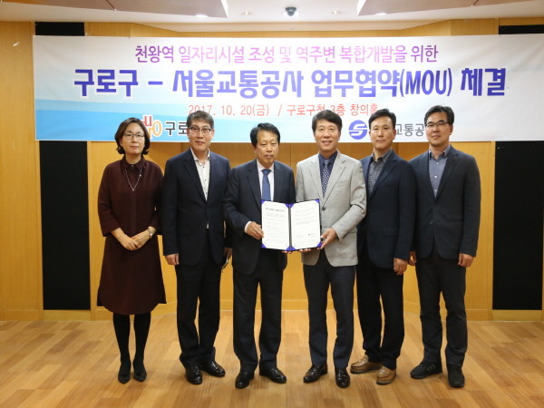 서울 구로구와 서울교통공사가 업무협력을 위한 양해각서(MOU)를 체결하고 구로 지역내 7개 역사 및 차량기지 등 공사의 인프라를 활용한 복합개발 사업추진에 나선다. 사진은 이성 구청장(왼쪽에서 세 번째)가 협약후 기념촬영을 하고 있는 모습.(사진제공=구로구청)