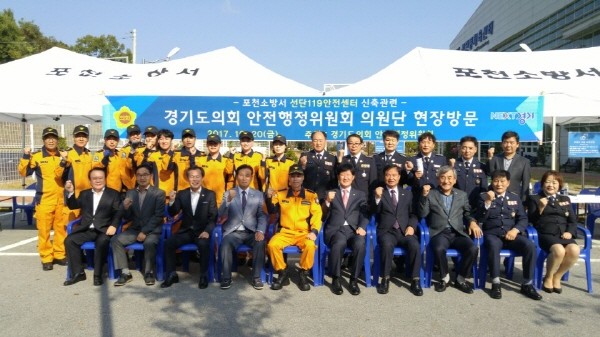 | ▲ 경기도의회 안전행정위원회 소속 의원들이 포천소방서를 방문, 119안전센터 신축 관련 추진현황을 점검하고 소방서 관계자들과 기념촬영을 하고 있다. | ||