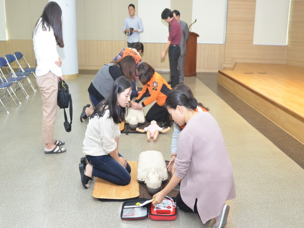 서울 영등포소방서는 지난 20일 오후 동작세무서 직원들을 대상으로 심폐소생술 및 하임리히법 등 소방안전교육을 실시했다. 사진은 참여자들이 심폐소생술 실습을 하는 모습.(사진제공=영등포소방서)