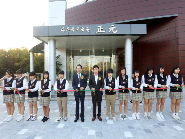 경기 용인시는 최근 처인구 남사면 소재 남사아곡도시개발조합의 후원으로 남사중학교에 지상 1층, 연면적 1148㎡ 규모로 조성된 다목적체육관의 개관식을 개최했다. 사진은 행사에 참석한 정찬민 시장(오른쪽에서 일곱 번째)과 학생들이 기념촬영을 하는 모습.(사진제공=용인시청)