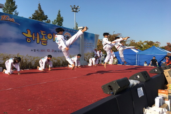 인천 연수구 송도1동 축제추진위원회는 지난 21일 해돋이 공원에서 주민 2000여 명이 참석한 가운데 ‘제10회 해돋이 축제’를 성황리에 개최했다. 사진은 참여자들이 태권도 공연을 선보이는 모습.(사진제공=연수구청)