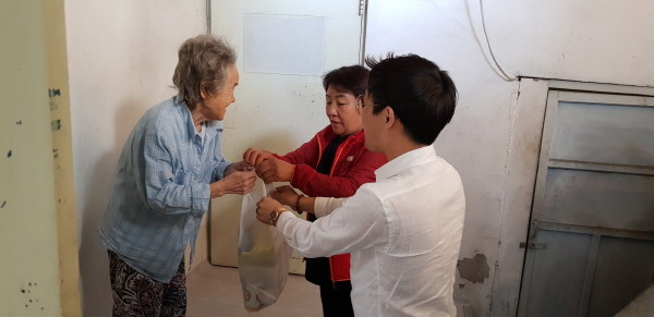 경기 동두천시 불현동 새마을부녀회와 지역사회보장협의체에서는 최근 '사랑의 밑반찬'을 만들어 저소득층 홀몸노인, 한부모 및 다문화가정 등 25가구에 전달했다. 사진은 참여자들이 노인에게 반찬을 전달하는 모습.(사진제공=동두천시청)