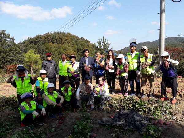경기 여주시 강천면에서는 지난 23일 장수지팡이의 재료로 재배하고있는 ‘명아주’와 이웃돕기를 위한 ‘고구마’를 수확했다. 사진은 참여자들이 수확한 고구마를 들고 기념촬영을 하는 모습.(사진제공=여주시청)
