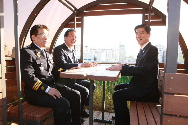 지난 23일 친환경 리모델링을 통해 에너지 절약형으로 재 탄생한 ‘강동구청 제2청사 개청식’이 개최됐다. 사진은 새롭게 조성된 제2청사 옥상에 조성된 휴식공간에서 관계자들과 이야기를 나누고 있는 이해식 구청장(왼쪽)의 모습.(사진제공=강동구청)