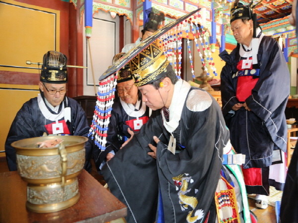 지난 22일 경기 연천군 미산면에 위치한 사적 제223호인 연천 숭의전에서 지난 고려 태조를 비롯한 현종, 문종, 원종 등 고려조 4왕에게 제를 올리는 '숭의전 추계대제'가 봉행됐다. 사진은 참가자들이 제를 올리고 있는 모습.(사진제공=연천군청)