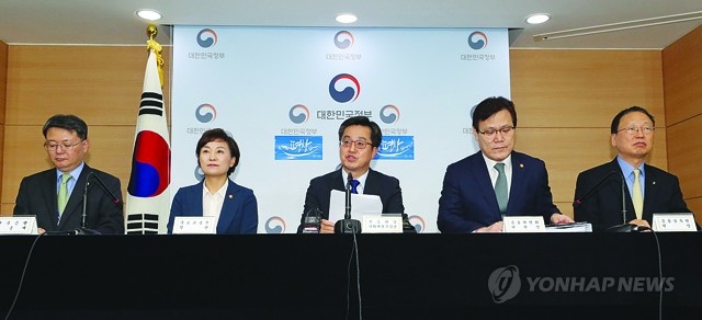 김동연 부총리 겸 기획재정부 장관이 24일 오후 정부서울청사에서 가계부채 종합대책을 발표하고 있다. 왼쪽부터 윤면식 한국은행 부총재, 김현미 국토교통부 장관, 김 부총리, 최종구 금융위원장, 최흥식 금융감독원장.