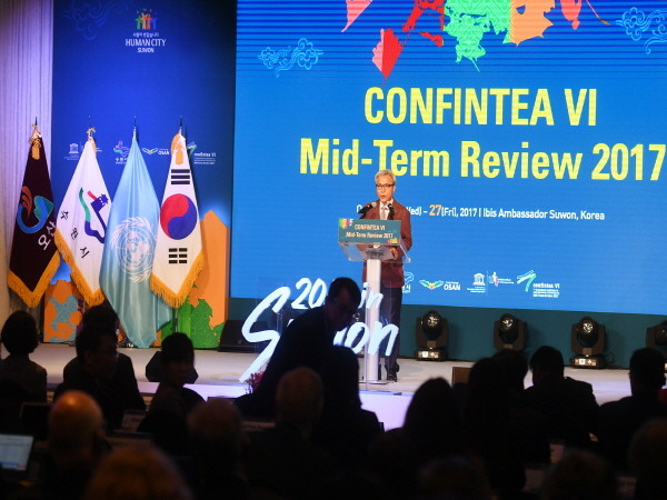 경기 오산시는 오는 27일까지 3일간 수원시와 공동으로 이비스앰베서더수원과 오산시청에서 ‘제6차 세계성인교육회의 중간회의’를 개최한다. 사진은 25일 개회식에 참석한 곽상욱 시장이 기념축사를 하고 있는 모습.(사진제공=오산시청)