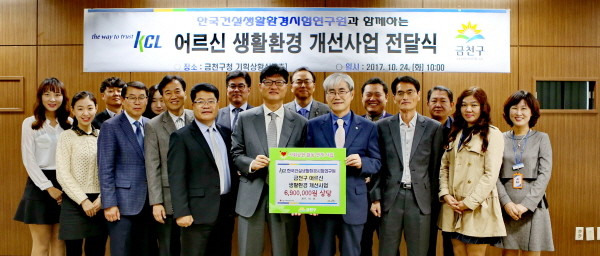 서울 금천구는 한국건설생활환경시험연구원과 지난 24일 오전 10시 복지문화국장실에서 경로당 4곳을 대상으로 진행하는 ‘어르신 환경개선사업’ 전달식을 개최했다. 사진은 관계자들이 기념촬영을 하는 모습.(사진제공=금천구청)