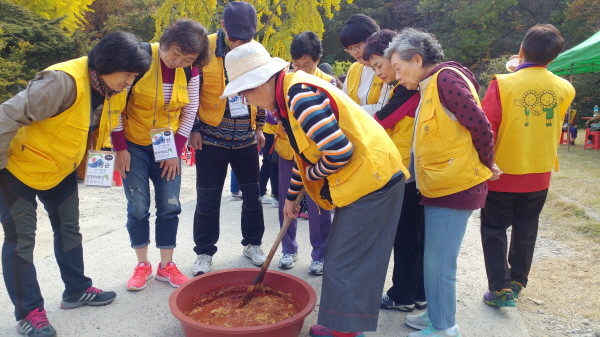 지난 24일 양천어르신종합복지관이 복지관 봉사자들 90여명을 대상으로 경기 포천 국립수목원과 양주 두래농원을 방문하는 ‘2017년 자원봉사자 나들이’ 행사를 실시했다. 사진은 행사에 참가한 봉사자들이 장 담그기 체험을 하는 모습.(사진제공=양천어르신종합복지관)