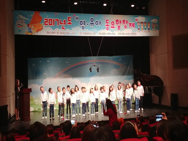 경기 포천시는 지난 24일 어린이집연합회 주관으로 반월아트홀 소공연장에서 지역내 어린이집 13팀, 280여명의 원생이 참가한 가운데 ‘영·유아 동요합창체’를 개최했다. 사진은 대회에 참석한 원생들이 합창을 하는 모습.(사진제공=포천시청)