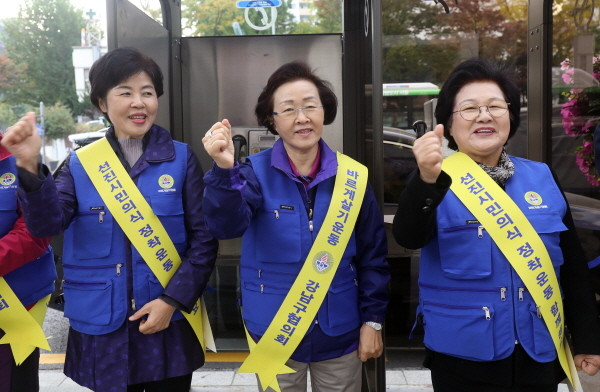 강남구 청담역 일대에서 26일 오전 ‘불법다단계 민생침해 예방 홍보 캠페인’ 행사가 진행됐다. 사진은 바르게살기운동 강남구협의회 회원들과 함께 캠페인을 펼치고 있는 신연희 구청장(가운데)의 모습.(사진제공=강남구청)