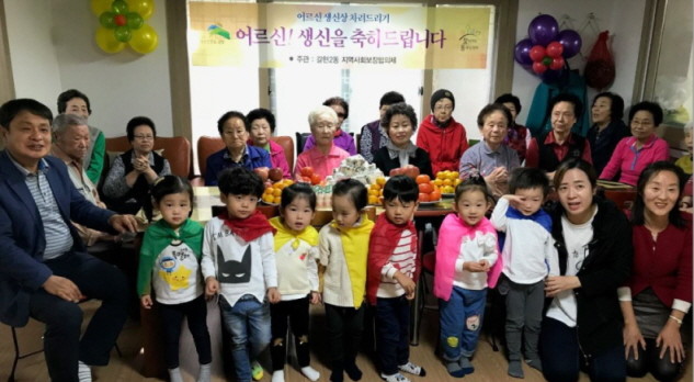 이날 행사는 오전 11시부터 음식을 준비하고 생신상을 마련해 경로당을 이용하시는 어르신 20명과 함께 점심을 나누며 생신을 축하해 주었다. 꿈동산 어린이집 아이들의 재롱잔치와 선물증정 시간도 함께 가졌다.