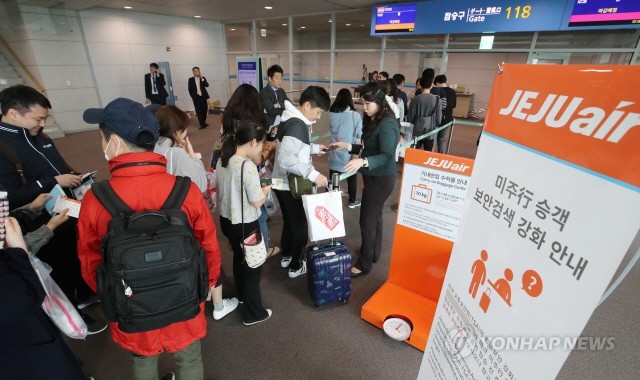 미 교통안전청(TSA) 요청에 따라 미국행 여객기 탑승객에 대한 보안 검색이 강화된 26일 인천공항 탑승동 출국게이트에서 승객들이 보안 인터뷰를 받고 있다.