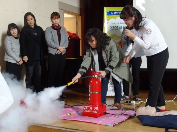경북 구미오산초등학교는 26일 교내 체육관에서 한국아동청소년안전교육협회 재난안전지도사와 함께 22명의 학부모를 대상으로 생활안전 및 심폐소생술(체험형)교육을 실시했다. 사진은 참여자들이 소화기 사용실습을 하는 모습.(사진제공=구미오산초등학교)