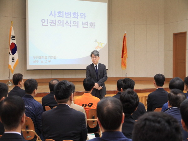 동작소방서는 26일 소방서에서 전직원을 대상으로 김근수 부천대 교수를 초빙해 ‘사회변화와 인권의식의 변화’라는 주제로 인권교육을 실시했다. 사진은 김 교수가 강의하는 모습.(사진제공=동작소방서)