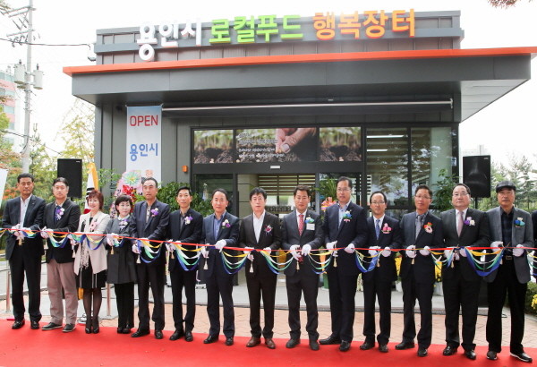 경기 용인시는 26일 경부고속도로 서울방향 죽전휴게소 진입로 입구에 69.3㎡에 로컬푸드직매장인 ‘행복장터’를 개장했다. 사진은 개장식에 참석한 정찬민 시장 등 관계자들이 테이프 커팅에 앞서 기념촬영을 하는 모습.(사진제공=용인시청)