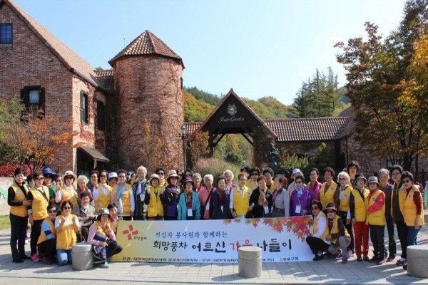 최근 대한적십자사봉사회 서울 종로지구협의회가 지역내 무의탁 노인 50여명을 대상으로 ‘적십자 희망풍차 가을 행복 나들이’를 실시했다. 사진은 가평을 방문한 노인들이 기념촬영을 하고 있는 모습.(사진제공=대한적십자봉사회 종로지구협의회)