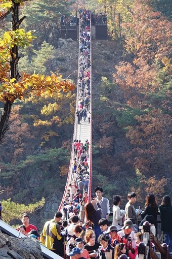단풍이 절정으로 물든 지난 28일 오후 경기도 파주시 적성면 감악산에서 전국 각지에서 온 많은 관광객이 감악산 출렁다리를 건너고 있다. 현재 파주 감악산 단풍맞이 축제가 열리고 있어 관광버스를 이용한 관광객들도 많이 찾고 있다.