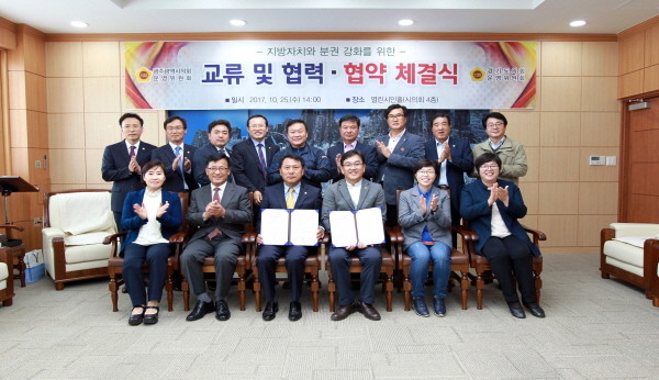 | ▲ 경기도의회 운영위와 광주시 운영위가 지방자치와 지방분권 강화를 위한 교류 및 협력 협약을 체결하고, 기념촬영을 하고 있다. | ||