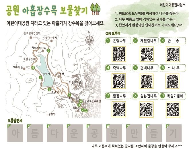 보물찾기 행사는 어린이 눈높이에 맞추어 보물지도의 QR코드 앱을 통해 힌트를 얻고, 어린이대공원에서 자라고 있는 수령 백년이상의 아홉가지 나무를 찾아가는 것이다.