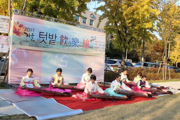 노원구는 지난 28일 노원도시농업협의회와 함께 경춘선 숲길 텃밭에서 ‘지역주민과 도시농부가 함께 하는 텃밭 음악회’를 개최했다. 사진은 음악회에 참여한 어린이들이 가야금을 연주하고 있는 모습.(사진제공=노원구청)