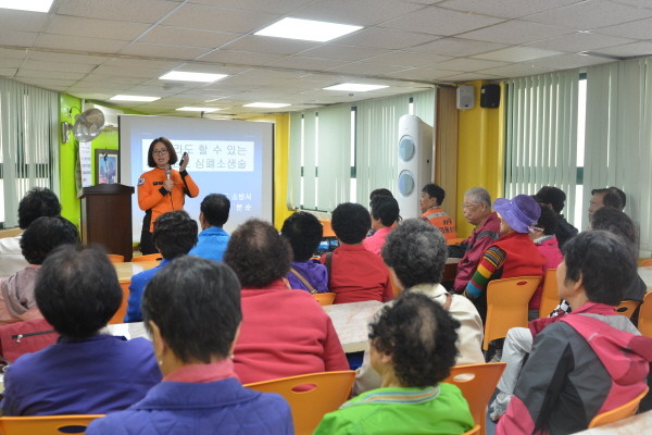 영등포소방서는 지난 27일 오후 서울 영등포구 신길동에 위치한 '영등포 장애인 사랑 나눔의 집'을 방문해 소방안전교육을 실시했다. 사진은 소방관이 거동이 불편한 노인을 대상으로 강의를 진행 중인 모습.(사진제공=영등포소방서)