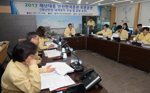 인천 연수구는 31일 구청 7층 재난종합상황실에서 ‘2017 재난대응 안전한국훈련 상황판단회의 및 재난안전대책본부 가동훈련’을 개최했다. 사진은 이재호 구청장(가운데) 및 관계자들이 토론하는 모습.(사진제공=연수구청)